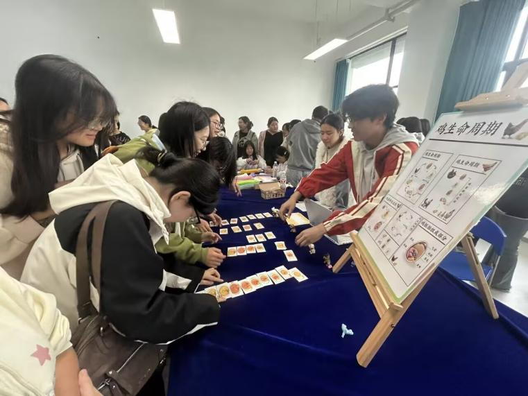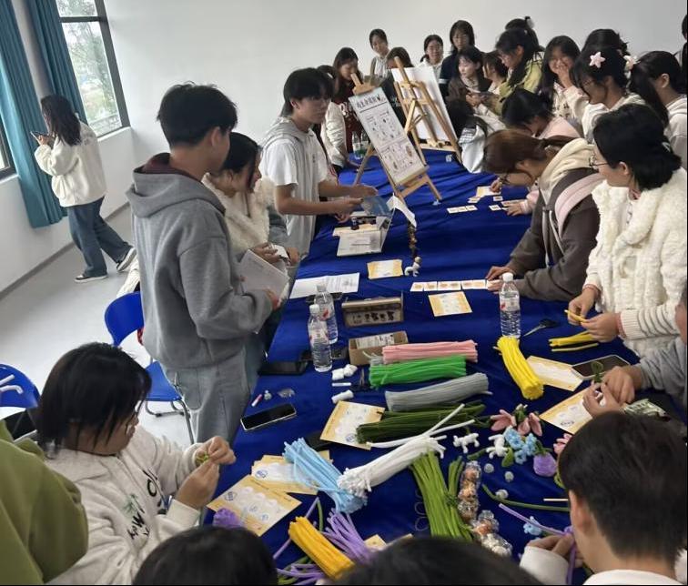 活动打破传统讲座式的时间管理教学模式,将农学院专业特色与时间管理理念深度融合,为全院同学打造了一场兼具趣味性、知识性与实践性的主题体验活动。现场设置了多个特色互动环节。“雏鸡生长贴贴乐”以家禽生长周期为线索,通过贴纸游戏生动展示时间规划的脉络;“指尖萌物”环节则让同学们运用扭扭棒手工制作动植物造型,在创造过程中学习任务分解与步骤安排;而“生命的节序”聚焦于水稻的节律变化,引导同学们思考时间管理与自然周期的内在联系。各环节互动性强、参与度高,现场氛围热烈融洽。
