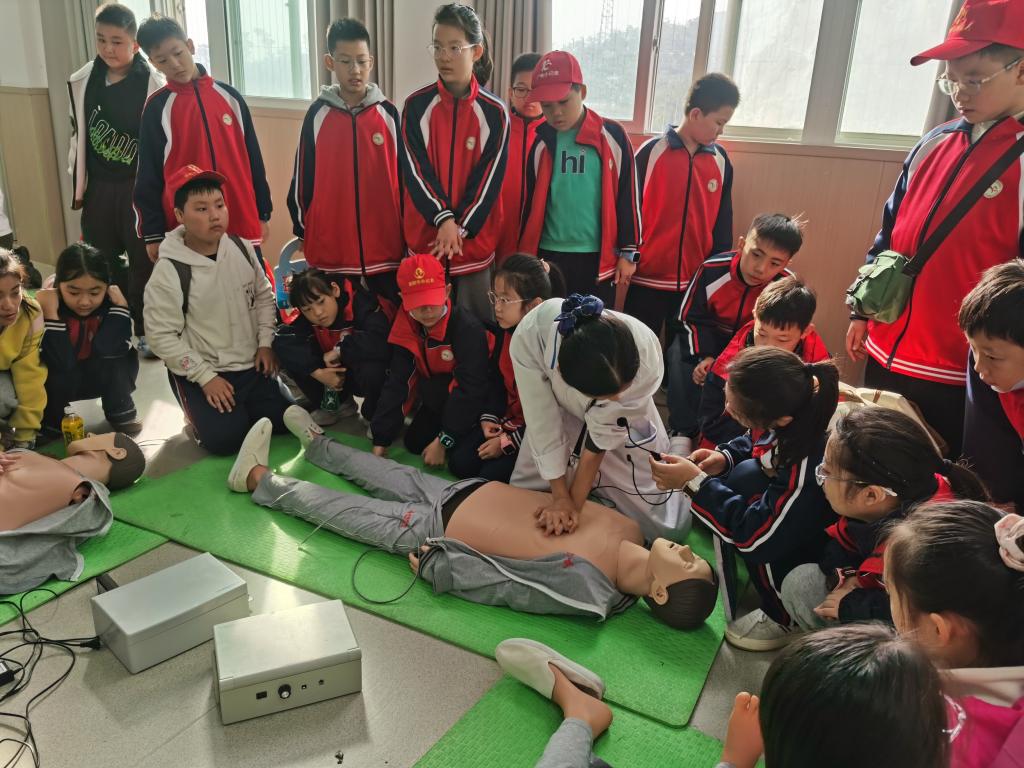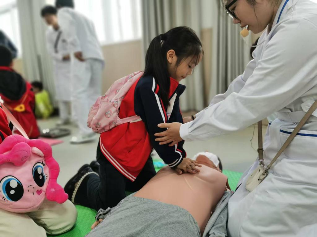 最令人期待的环节当属护理操作实践课。180名小学生被分成三个小组,在专业护理教师的指导下,分别学习心肺复苏、外伤包扎、海姆立克急救法三项实用技能。在心肺复苏实训区,老师先通过模型演示按压位置、力度和频率,再手把手教同学们操作,纠正不规范的动作;在外伤包扎区,同学们认真学习三角巾、绷带的使用方法,还两两一组互相练习,体验“小护士”的角色;在海姆立克急救法教学中,老师结合真实案例讲解急救原理,并用模型演示正确姿势,让同学们快速掌握关键步骤。整个实践过程中,同学们热情高涨,积极提问、主动尝试,脸上满是认真与专注。
