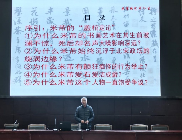 吴新兵以时间为脉络,梳理米芾21岁至57岁的仕途与人生起伏。他从个人性情、家庭背景、社会环境及普世价值观四个维度,深入剖析了米芾游走政坛边缘的原因。米芾的狂放不羁与官场规则的格格不入,加上家族背景的隐性影响,共同塑造了他独特的人生轨迹,使师生对“文人与仕途”关系有了更深刻的认识。吴新兵着重解读了米芾书画艺术“生前寂寂、死后昭昭”的现象。据介绍,米芾生前未获广泛认可,但他在笔墨技法上的革新与对“意趣”的不懈追求,成为后世中国书法史的重要里程碑,这一现象引发师生对艺术价值时效性的思考——艺术价值常需时间沉淀与历史检验方能显现。