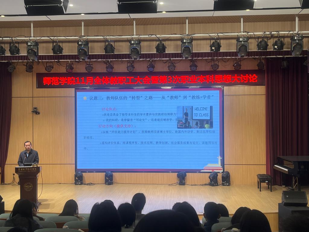 11月27日下午,师范学院在博学楼演播厅召开11月全体教职工大会暨第3次职业本科思想大讨论会议。会议由党总支书记张丹主持,全体教职工参会。