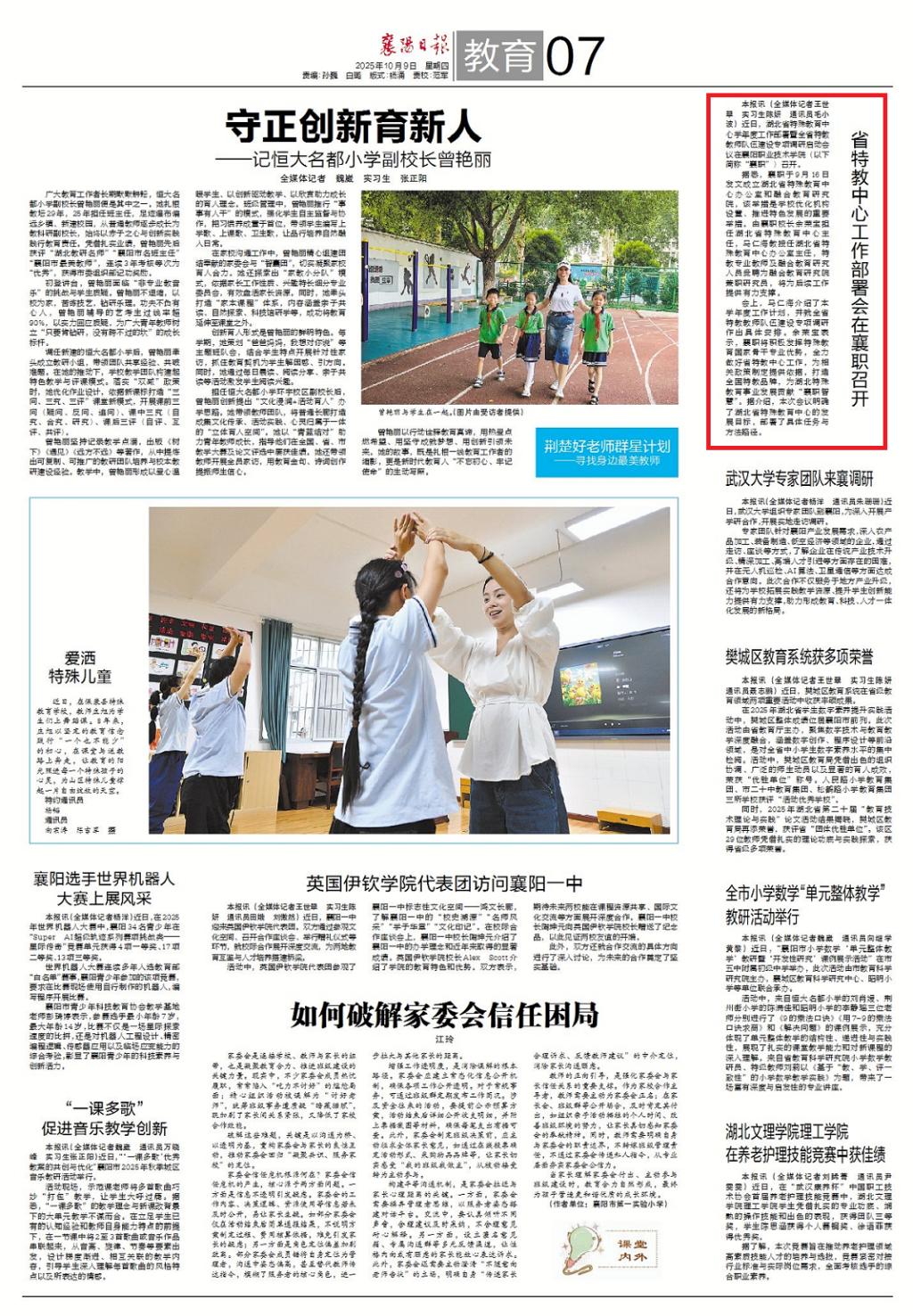本报讯(全媒体记者王世翠 实习生陈妍 通讯员毛小波)近日,湖北省特殊教育中心学年度工作部署暨全省特教教师队伍建设专项调研启动会议在襄阳职业技术学院(以下简称“襄职”)召开。