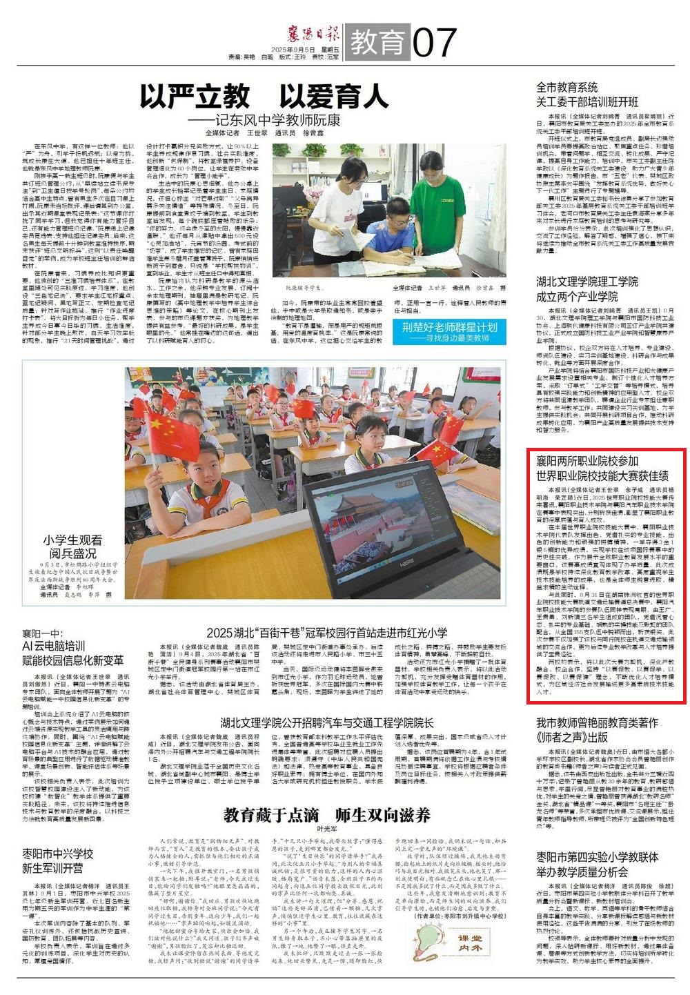 本报讯(全媒体记者王世翠 余子威 通讯员杨明海 荣芷颖)近日,2025世界职业院校技能大赛传来喜讯,襄阳职业技术学院与襄阳汽车职业技术学院在赛事中表现突出,分别斩获佳绩,彰显了襄阳职业教育的深厚底蕴与育人成效。