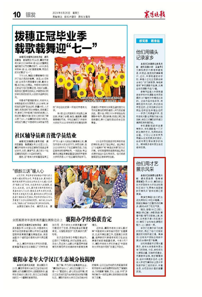 本报讯【全媒体记者朱月皎 通讯员赵杰 张艳丽 谭薇娜】6月20日,襄阳职业技术学院老年大学在该校南校区举办“礼赞伟大祖国银龄尽展风采”教学成果汇报展演。